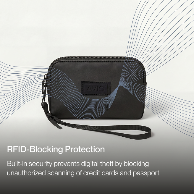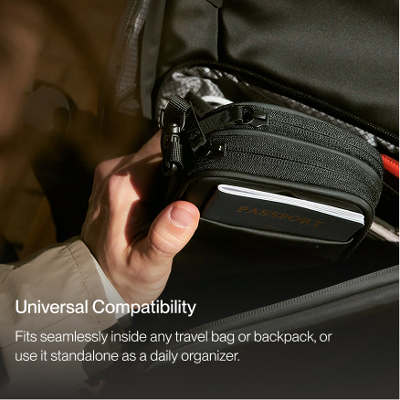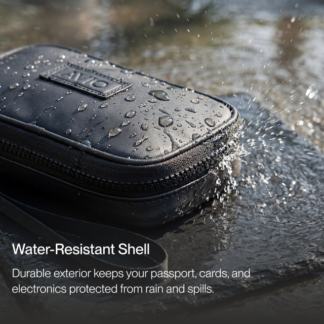 Compact design fits passport, boarding pass, cables, chargers, power banks, and cards—without bulk. RFID-blocking protection prevents digital skimming. Waterproof shell keeps everything dry.